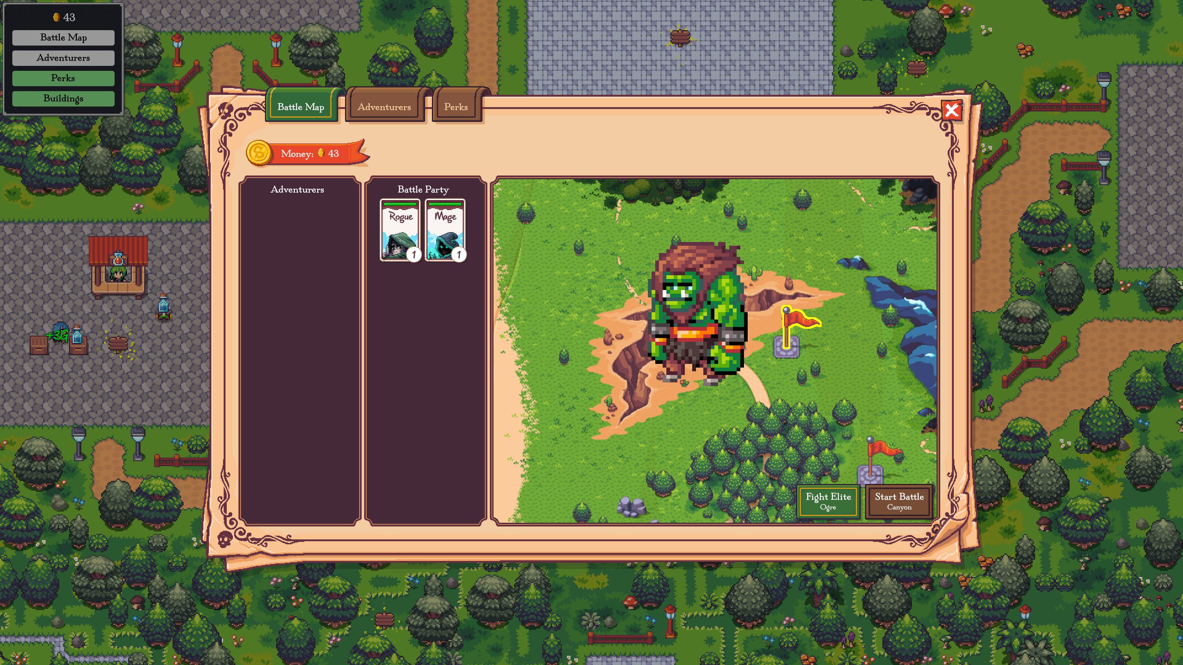 - Hiring adventurers, forming parties with them, and choosing where they'll battle